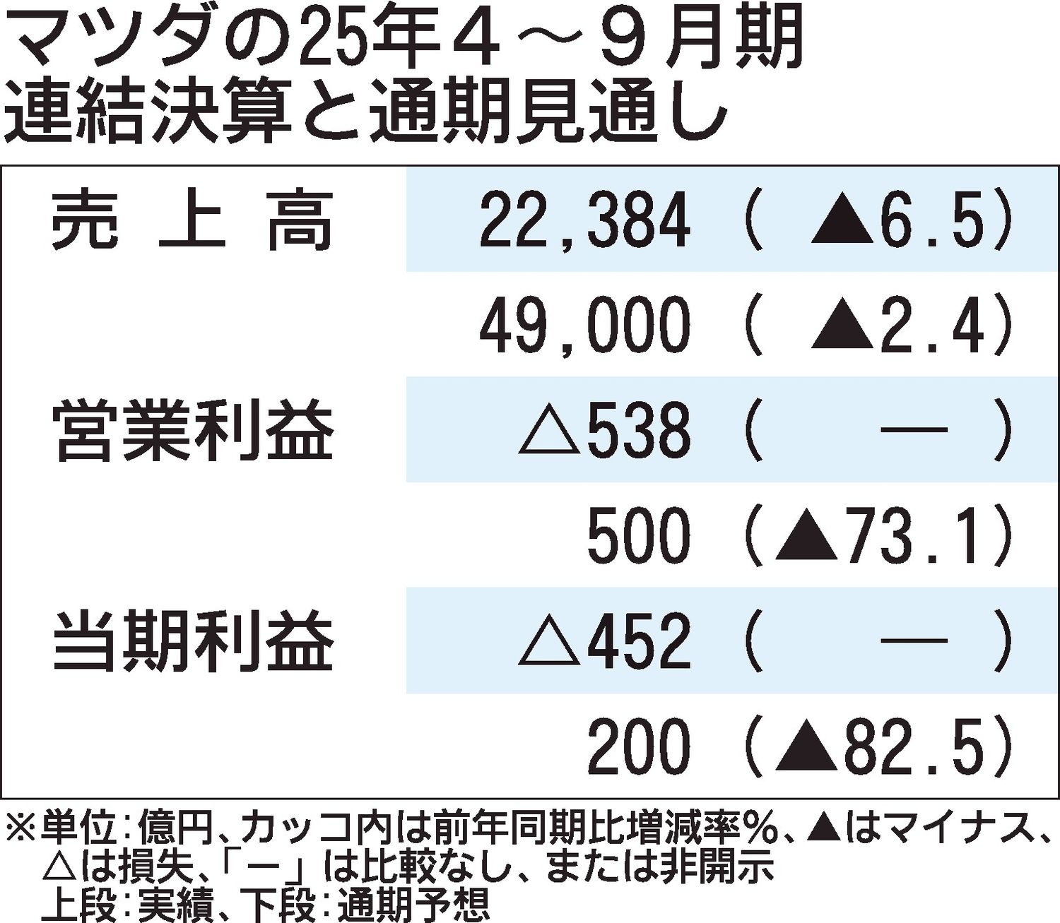 マツダが発表した2025年4~9月期の営業損益は538億円の赤字、純損益も452億円の赤字だった。最終赤字は5年ぶり。ただ、26年3月期は営業利益500億円、純利益200億円を確保する従来予想を変えなかった。米国の自動車関税による影響は1...
