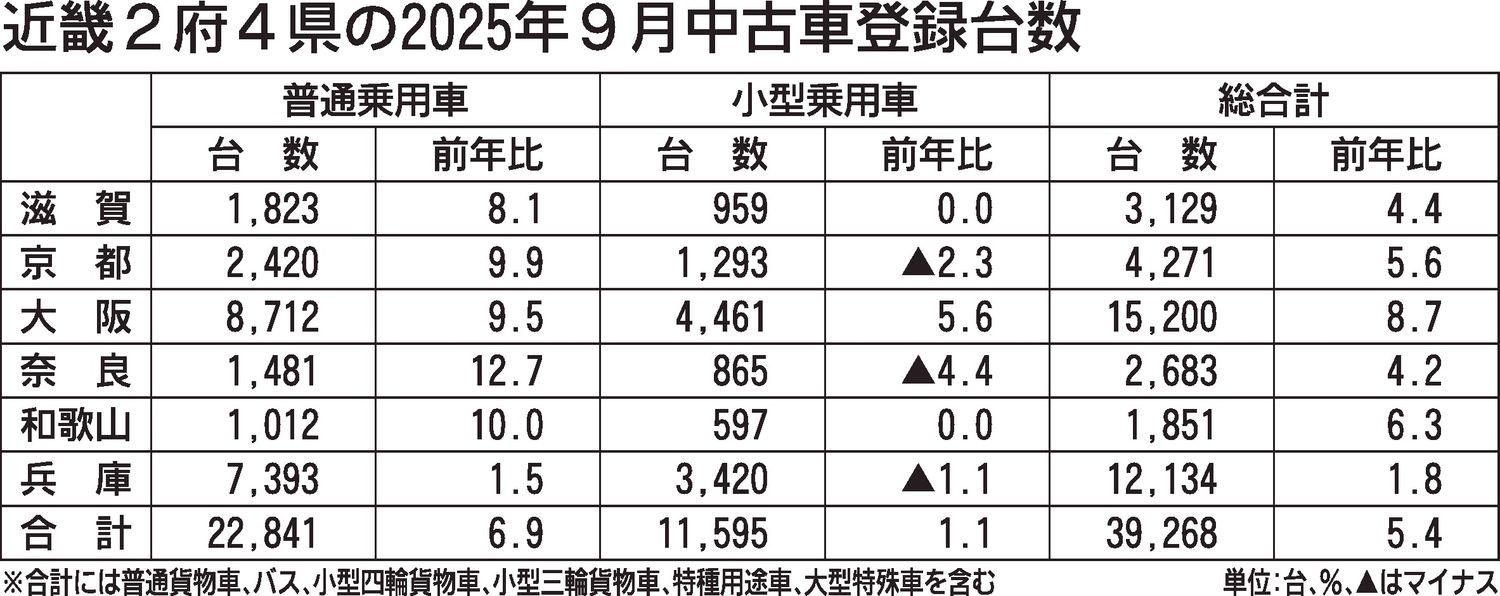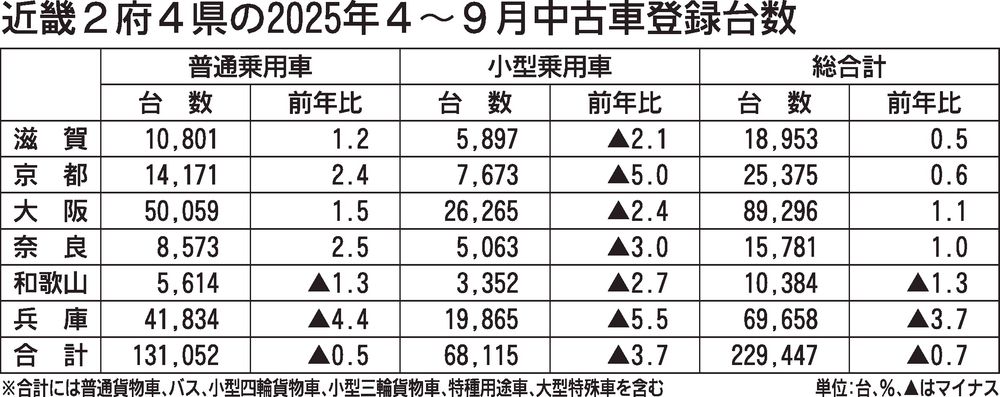 近畿2府4県の2025年度上期(4~9月)の中古車登録実績(軽自動車を除く)がまとまった。新規・移転・変更手続きを合算した登録台数は、前年同期比0.7%減の22万9447台で、上期としては3年ぶりに減少した。 25年度上期は新車の販売不振...