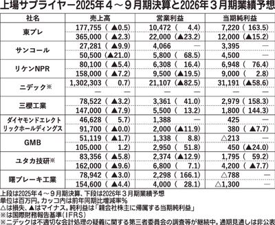 〈上場サプライヤー2025年4~9月期決算と2026年3月期業績予想〉(11/27付)