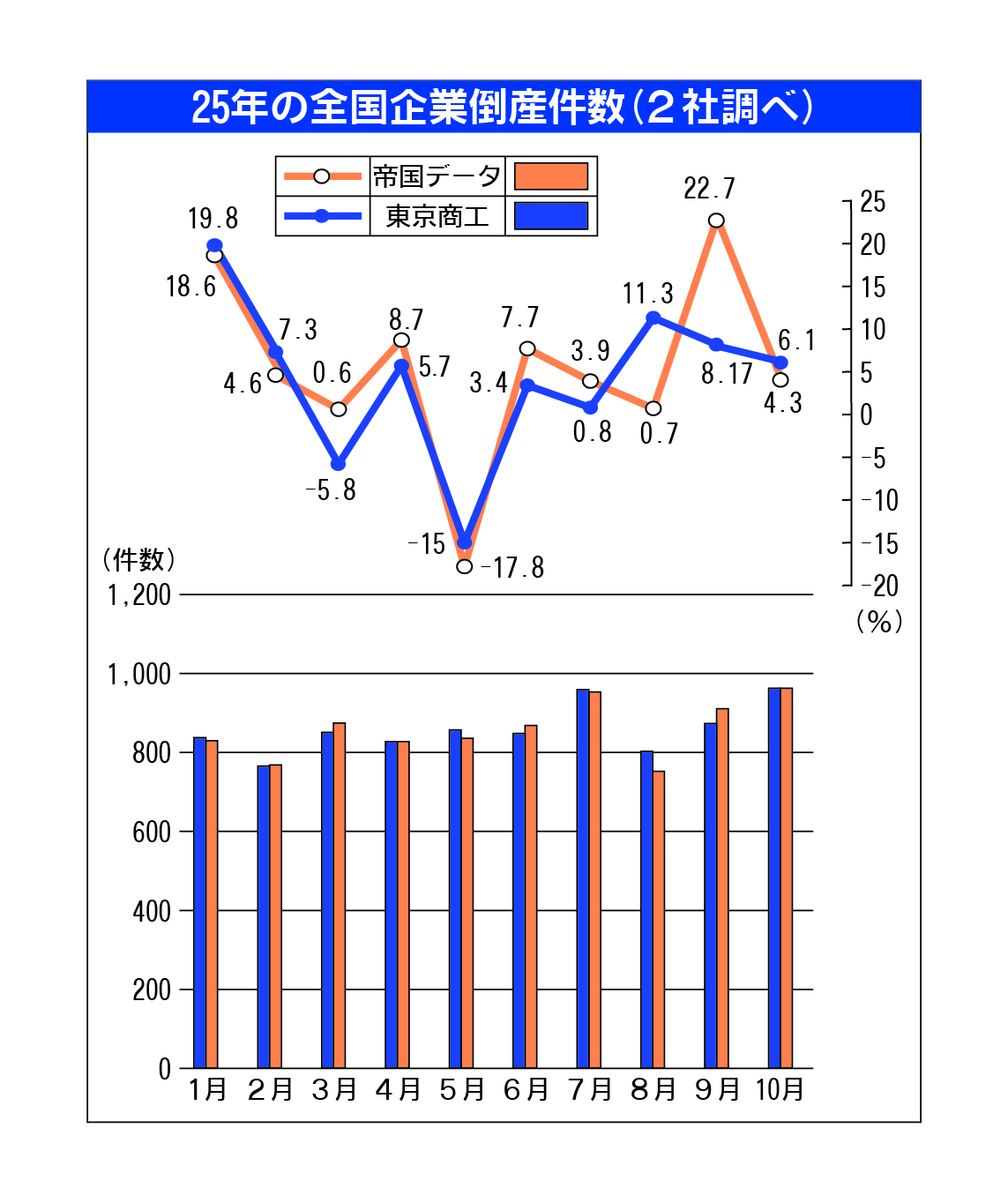帝国データバンク(TDB)と東京商工リサーチ(TSR)は11日、2025年10月の企業倒産件数を公表した。TDB調べでは、前年同月比4.3%増の965件と5カ月連続で増えて今年最多だ。TSR調べ(負債1千万円以上)でも同6.1%増の965...