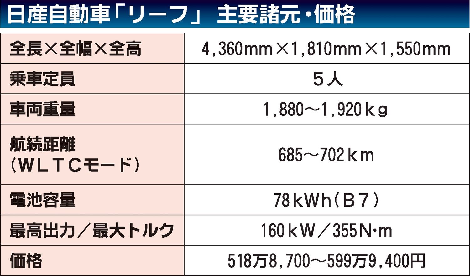 日産自動車は電気自動車(EV)「リーフ」をフルモデルチェンジして10月17日から国内での受注を始めた。新型車はEV購入時の不安要素をなくすため、航続可能距離を最大702キロメートル(WLTCモード、国内仕様)に伸ばした。日産では新型リーフ...
