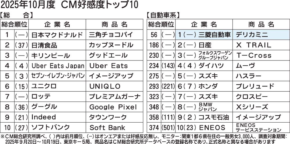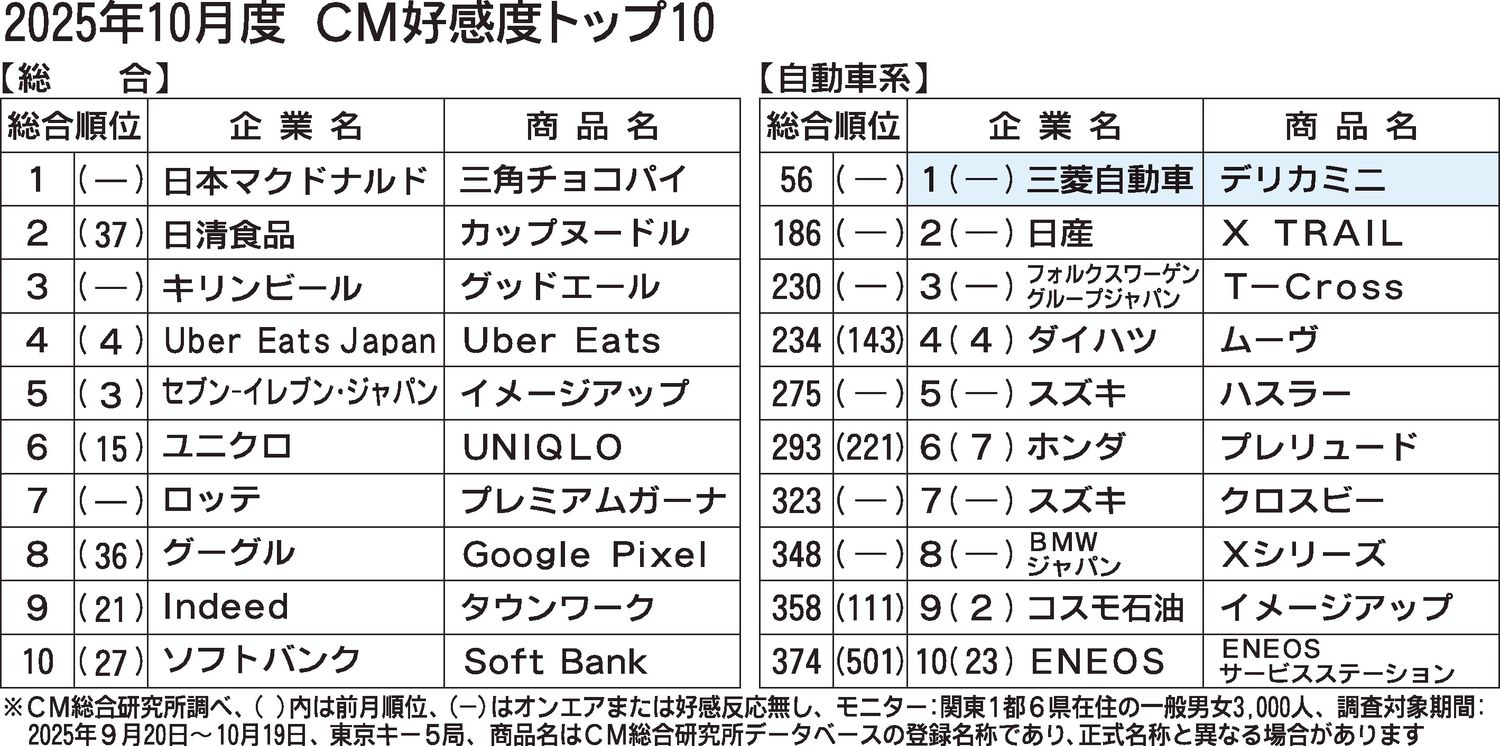 CM総合研究所(関根心太郎代表、東京都千代田区)は、2025年10月度のCM好感度ランキングを公表した。総合ランキングで、自動車業類は28カ月連続でトップテンを逃した。今回の対象期間である2025年9月20日~10月19日に放映された全C...