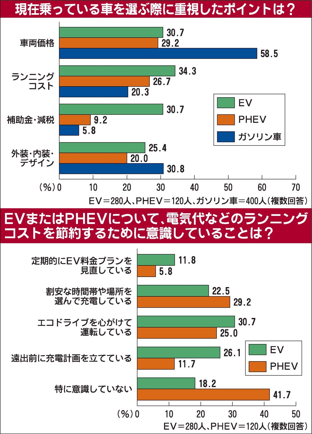 ENEOS(エネオス)は、電気自動車(EV)とプラグインハイブリッド車(PHV)ユーザー、ガソリン車ユーザーを対象に、車選びの際に重視した点や、ランニングコストの意識などについて調査した。この結果、EVとPHVユーザーの大半が「節約できて...