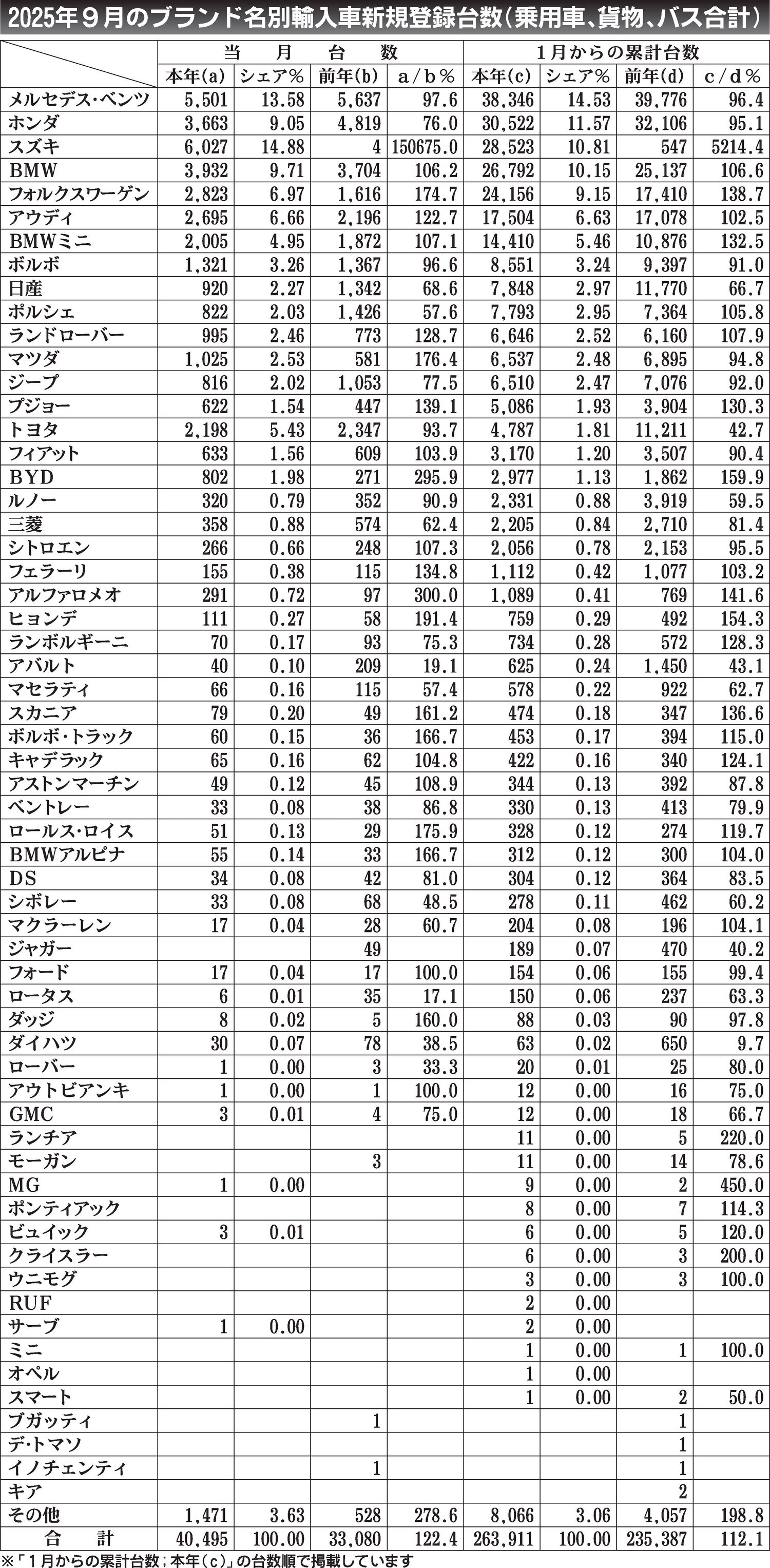 〈2025年9月のブランド名別輸入車新規登録台数(乗用車、貨物、バス合計)〉