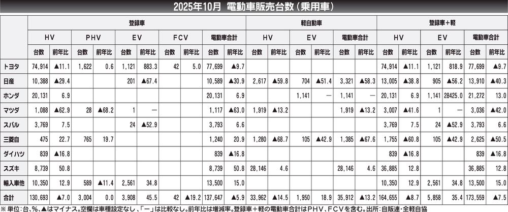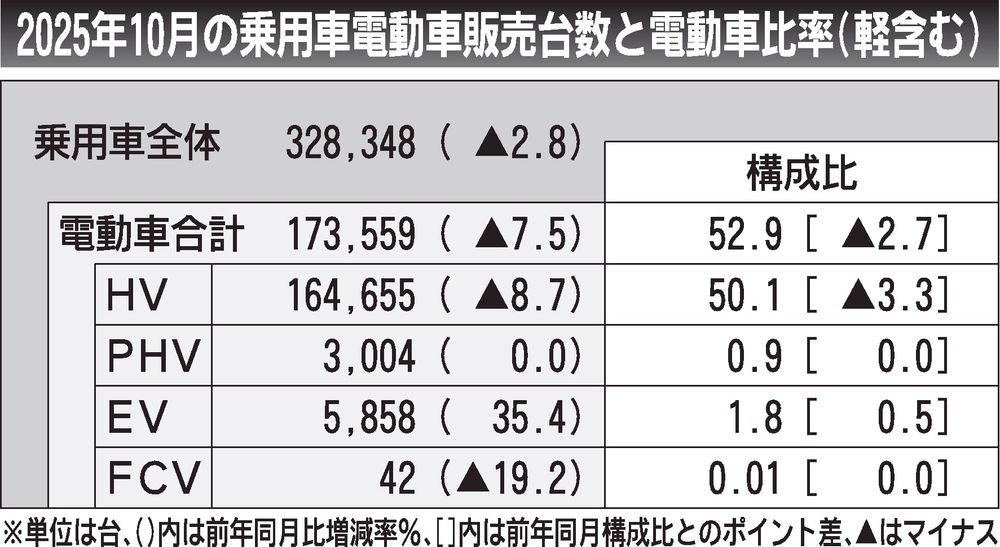 10月の国内電動車販売(乗用車)は前年同月比7.5%減の17万3559台と4カ月連続で前年実績を下回った。電動車市場の9割を占めるハイブリッド車(HV)の販売が伸び悩んだ。一方、電気自動車(EV)はトヨタ自動車やホンダの新型車が販売を伸ば...