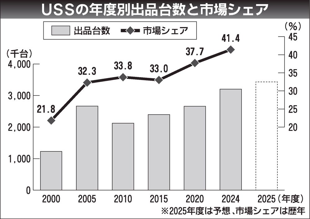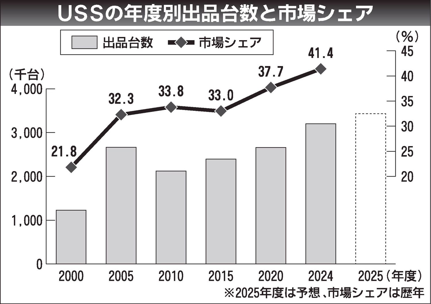 ユー・エス・エス(USS)は、中古車オークション(AA)市場の出品台数シェアを3年以内に45%に引き上げる。2025年上半期(1~6月)では42.8%となっており、26年1月に横浜会場のリニューアルを完了することから、一層の出品ボリューム...