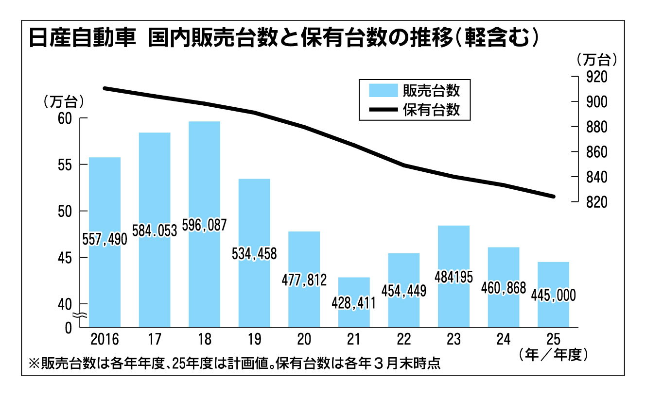日産自動車の国内販売台数は、10年前と比べて2割も縮小した。新車の販売減で保有台数も100万台少なくなっており、整備をはじめとする販売会社の収益基盤も揺らぐ。こうした状況を打破しようと、新型車の発売を積極化することで母国市場の再強化を目指...