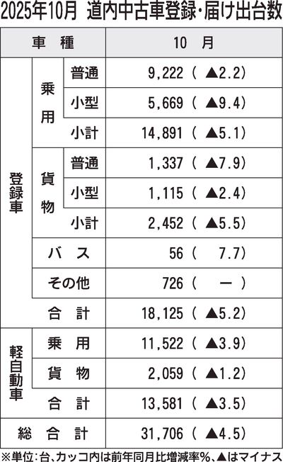 10月の道内中古車登録・届け出台数は、3万1706台(前年同月比4.5%減)だった。登録車、軽自動車ともに、前年同月の台数を下回った。 日本自動車販売協会連合会の中古車登録台数と全国軽自動車協会連合会の軽自動車中古車販売台数をまとめた。...