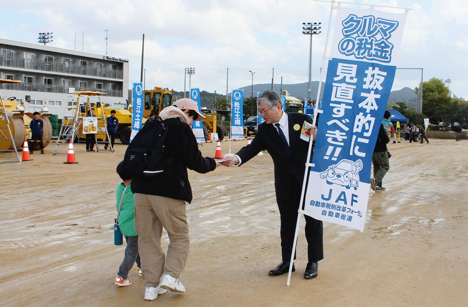 【松江】日本自動車連盟(JAF)島根支部(野々村健造支部長)は、松江市の旧県立プール跡地で開催されたイベント会場で、自動車税制改革フォーラム、自動車総連のメンバーとともに自動車に関する税金に対して周知活動を実施した。 JAF職員や改革フォ...