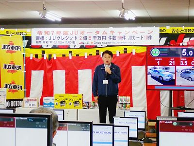 【甲府】JU山梨(日向東宏理事長)は、「オールJU全国リレーAA(中古車オークション)」を開催した。日向理事長は「少し出品目標には足りなかったが、高年式の良い車が入っている」とあいさつ。 結果は出品が92台、成約台数が40台、成約率は43...