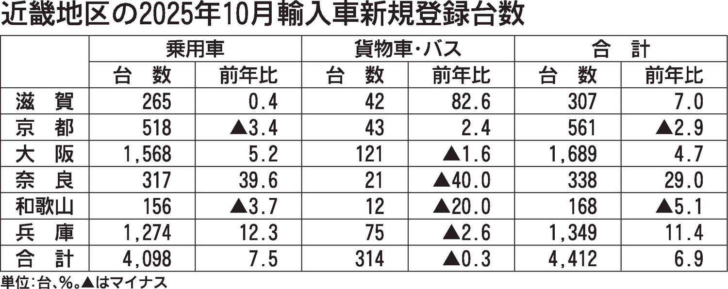 日本自動車輸入組合(JAIA)の発表によると、10月の近畿地区の輸入車新規登録台数(外国メーカー車と日本メーカー車)は、前年同月比6.9%増の4412台で、2カ月連続で増加した。 乗用車は同7.5%増の4098台で、2カ月連続のプラス。貨...