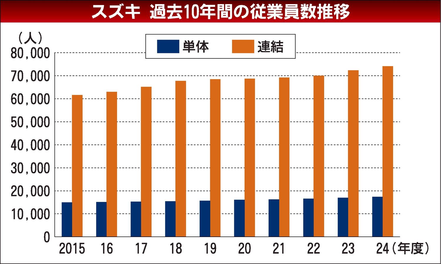 スズキは、2030年度までの中期経営計画で売上高を24年度比1.4倍の8兆円、営業利益を同1.2倍の8千億円を目指す。「稼ぐ力」を高めるため、注力するのは従業員一人ひとりの能力向上だ。従業員数(24年度)は15年度に比べ17%増の1万7千...