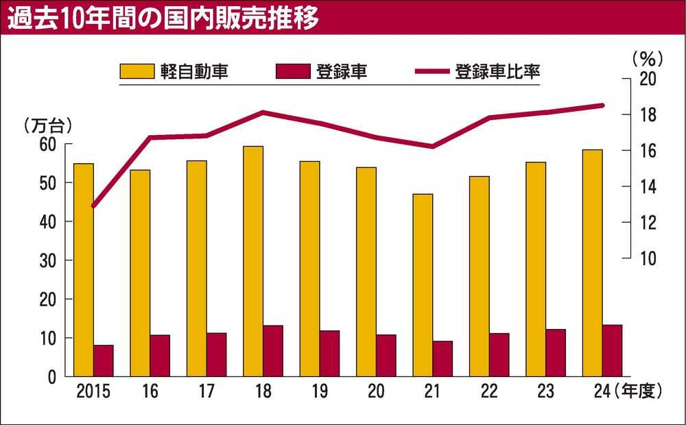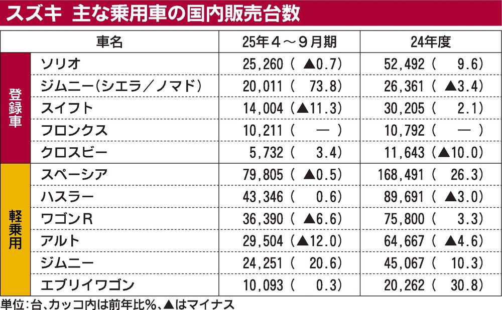 国内はピーク時の777万台(1990年)から442万台(2024年)へと4割強減っている。しかし、スズキは「国内は成長市場」と断言する。コロナ禍などで底だった21年度以降はじりじりと販売台数を増やす。特に、登録車の比率が高まっている。軽自...