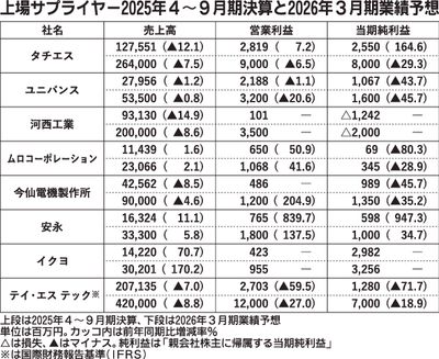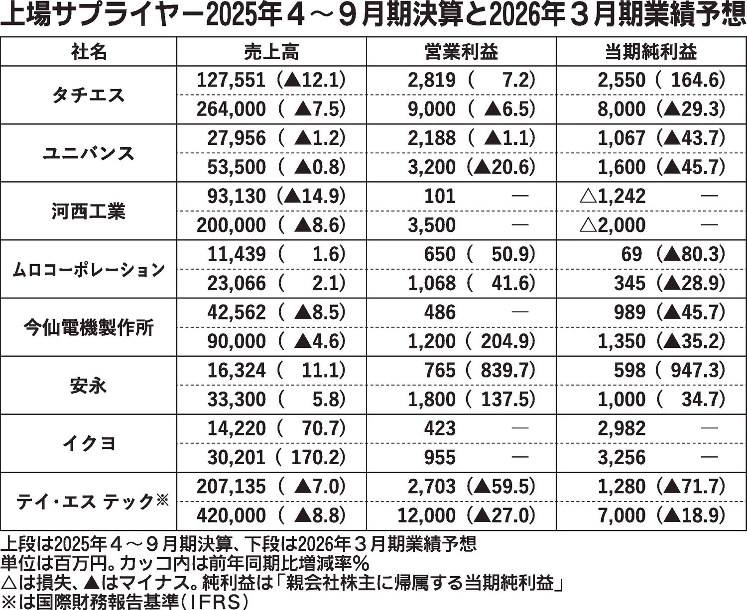 〈上場サプライヤー2025年4~9月期決算と2026年3月期業績予想〉(11/28付)