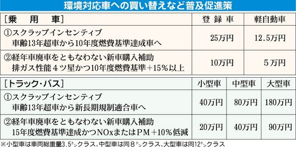Q どんな制度なの? A 環境性能に優れる新車の買い替えや購入を促し、経済対策と環境対策の一石二鳥を狙う制度です。乗用車では車齢13年超の古い車を廃車し、2010年度燃費基準達成の新車を購入する人(スクラップ・インセンティブ)に登録車で2...