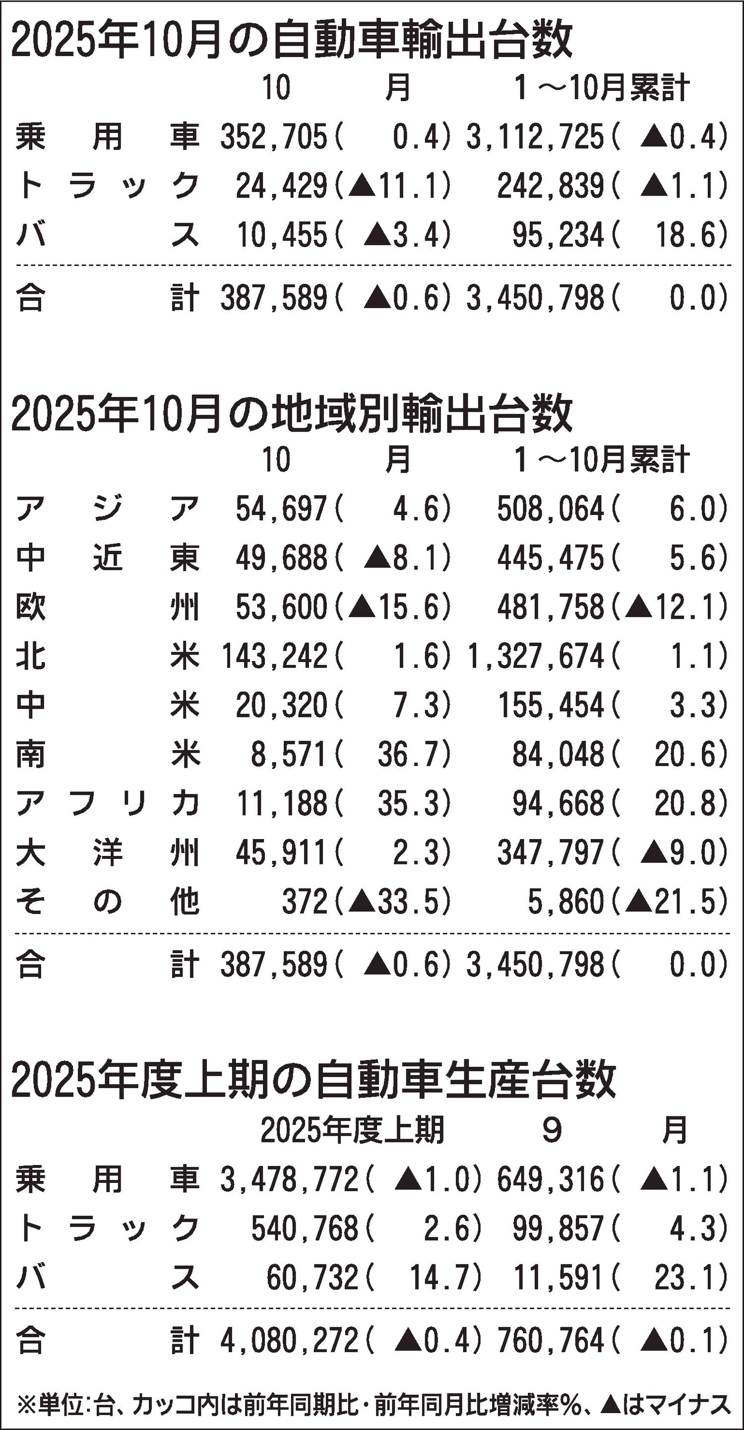日本自動車工業会(片山正則会長)が発表した10月の輸出台数は前年同月比0.6%減の38万7589台で2カ月連続のマイナスだった。乗用車は微増だったが、トラック(同11.1%減)とバス(同3.4%減)が前年実績を下回った。
