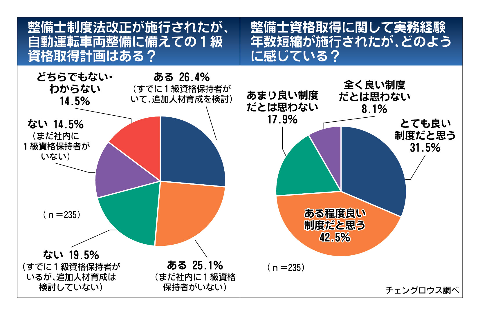 7月に見直された整備資格制度を受け、整備工場の経営者の過半数が、従業員に国家一級自動車整備士を取得させる計画があることが、チェングロウス(湊川満也社長、東京都中央区)の調査で分かった。二級や三級で必要な実務経験の期間を短縮した一方、自動運...