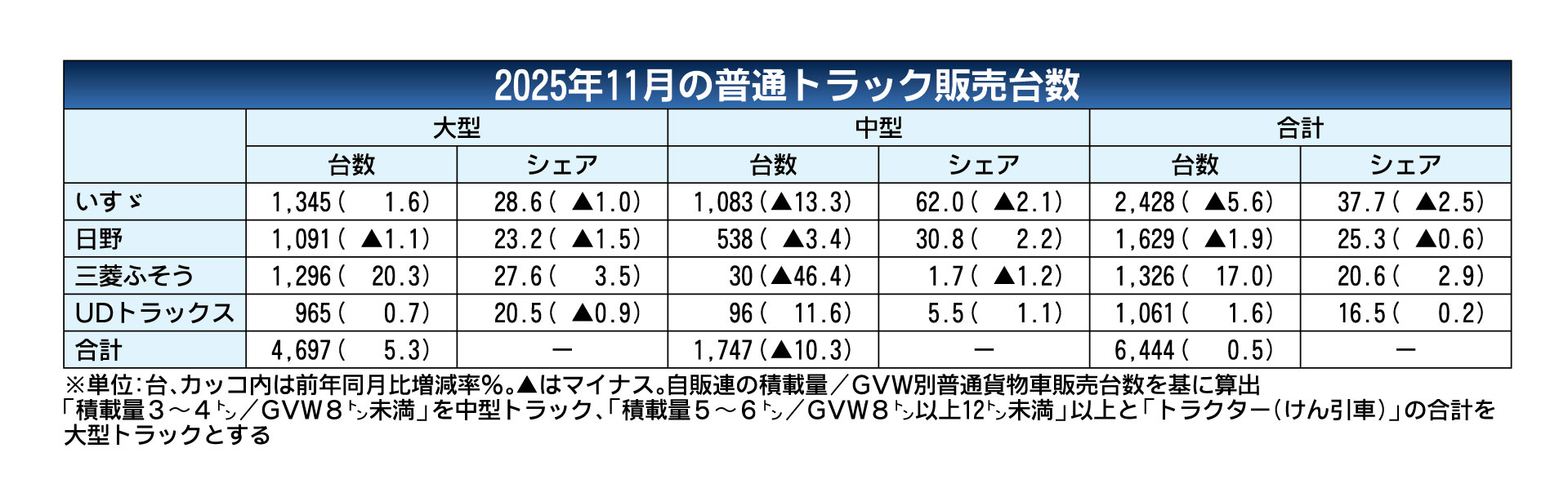 11月の普通トラック(積載量4トン級以上、中・大型の合計)の国内販売台数は、前年同月比0.5%増の6444台となり、7カ月連続で増加した。中型は減少したものの、大型が増え、全体の台数を押し上げた。 メーカー別では、いすゞ自動車(同5.6%...