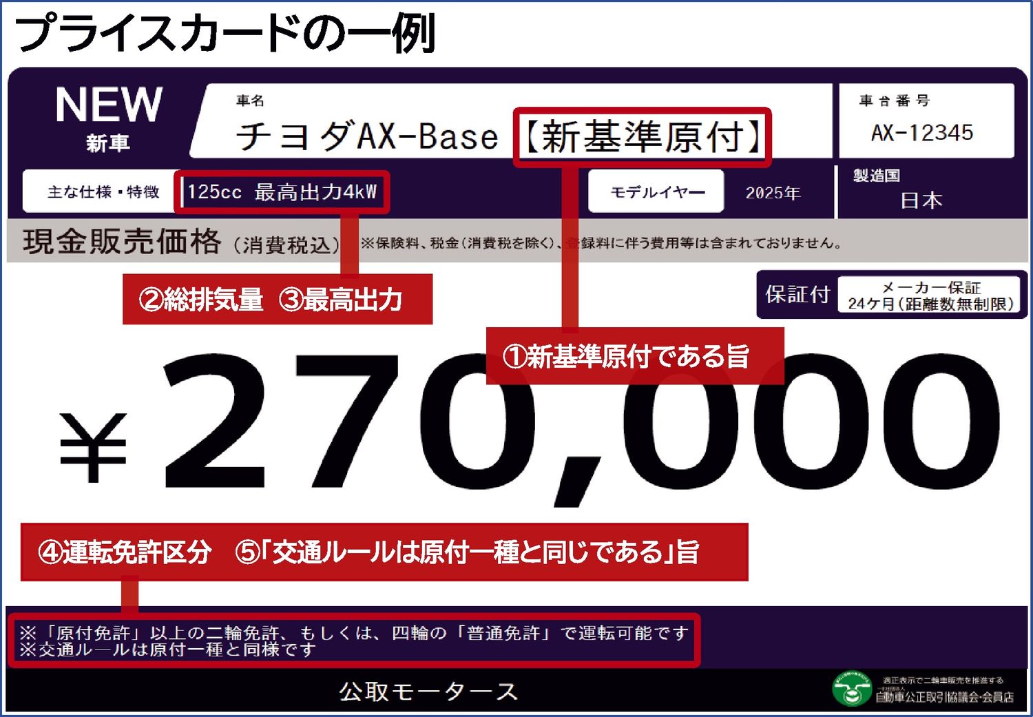 自動車公正取引協議会(自動車公取協、鈴木俊宏会長)は、第1種原動機付自転車(原付1種)に2025年春から加わった新基準に対応する車種の展示や広告の表示基準を策定した。車両区分が「新基準原付」であることや原付免許以上の二輪車免許で運転できる...