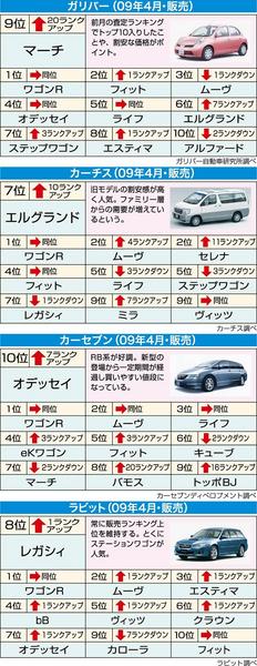 ガリバー自動車研究所、カーチス、カーセブンディベロプメント、ラビットが調べた2009年4月の中古車販売ランキングがまとまった。オデッセイやエルグランドなどミニバンのランクアップが各社で目立ち、多人数乗り車の底堅い需要がうかがえる結果となっ...