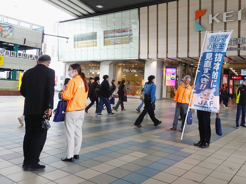 日本自動車連盟(JAF)大阪支部(小林恭彦支部長)は、大阪市都島区のJR・京阪電鉄の京橋駅前で自動車税制の見直しを訴える街頭活動を実施した。「二重課税」の是正や「当分の間税率」の廃止などの改正要望を記載したチラシ1千部を、通行人に配布した...
