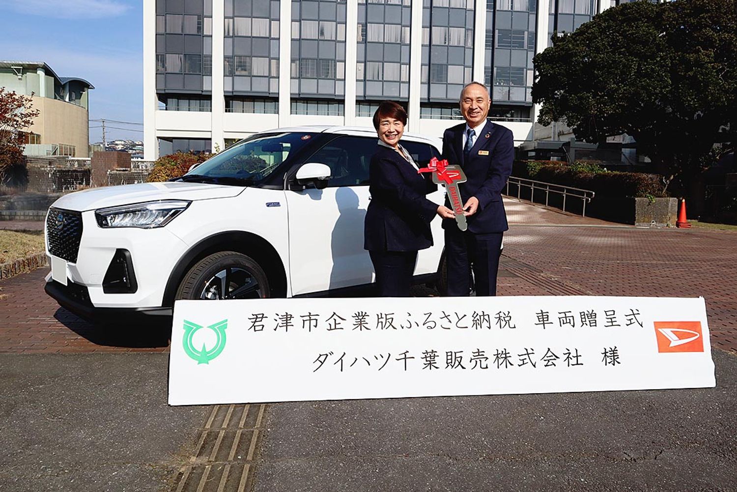 【千葉】ダイハツ千葉(近藤治郎社長)は、企業版ふるさと納税(地方創生応援税制)を活用したハイブリッド車の寄付を君津市に行った。その寄付式が同市庁舎で開かれた。 ダイハツ千葉は、2021年3月に君津市と包括連携協定を結んだ。同年12月には「...