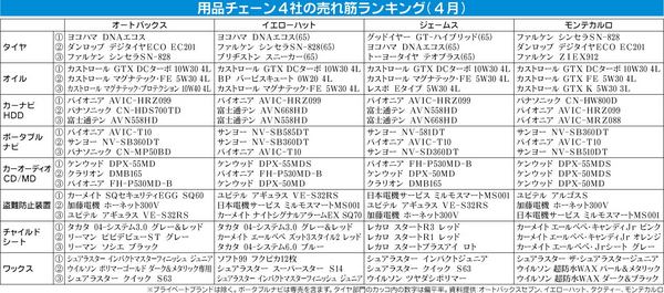 タイヤ部門では、DNAエコス、シンセラSN―828、デジタイヤECOの3モデルが上位を占める。モンテカルロではZIEX EX912が3位に初ランクインした。また、3位外だが、DNAアース1がオートバックスで7位、ジェームスで6位、エナセー...