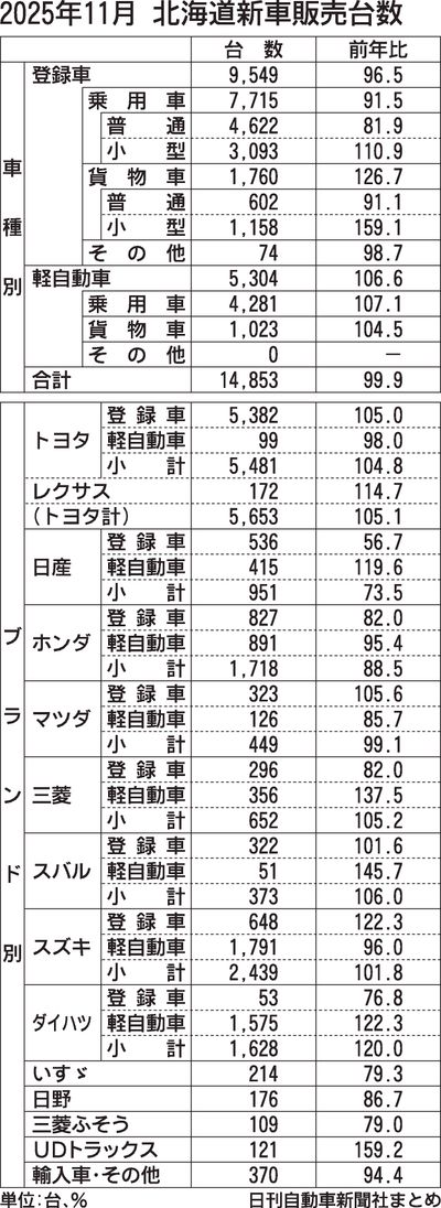 11月の道内新車販売台数(登録車と軽自動車の合計)は、前年同月比0.1%減の1万4853台となり、3カ月ぶりに前年を下回った。軽自動車は同6.6%増の5304台で11カ月連続の前年超えだったが、登録車が同3.5%減の9549台と2カ月連続...