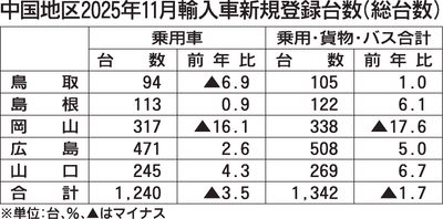 日本自動車輸入組合(JAIA)の発表によると、11月の中国地区の輸入車新規登録台数(外国メーカー車と日本メーカー車)は、前年同月比1.7%減の1342台で3カ月ぶりに減少した。岡山県のみの減少だったが、ほかの4県が微増だったために全体を押...