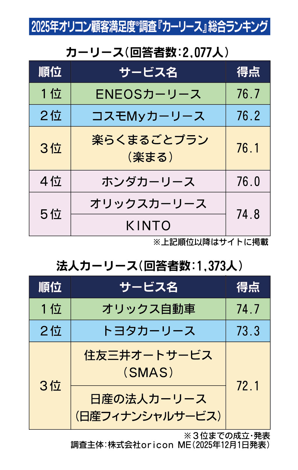 カーリースの顧客満足、個人トップはエネオス 法人はオリックス自動車 オリコンME調査
