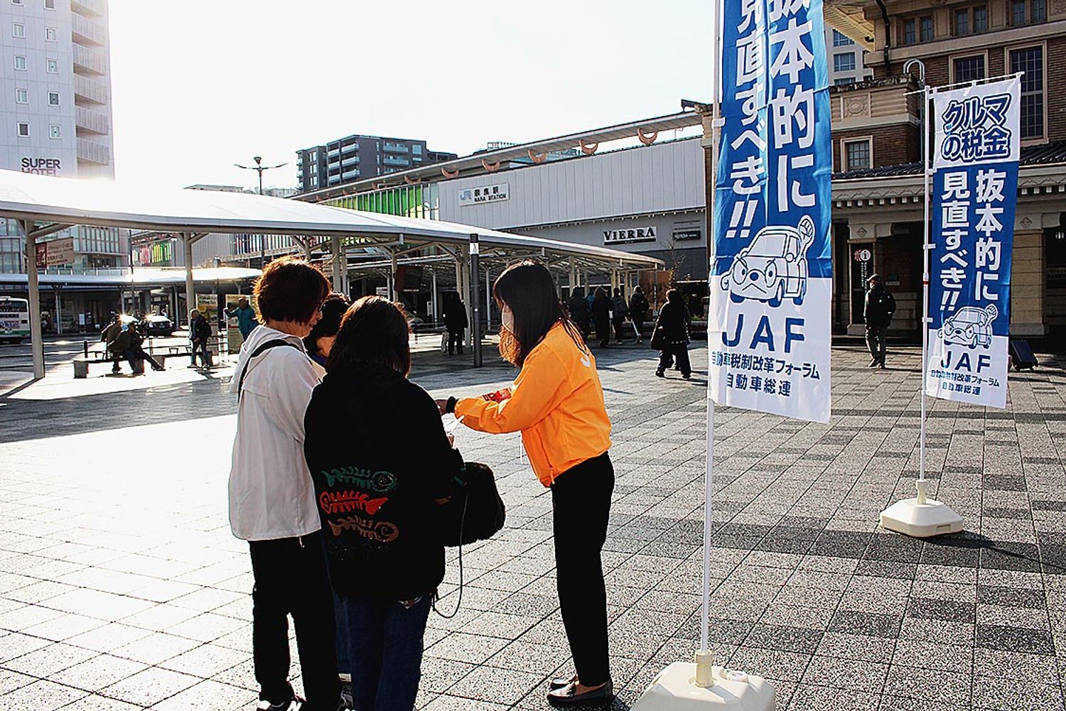 【奈良】日本自動車連盟(JAF)奈良支部(菊池攻支部長)は、自動車ユーザーの過重な税負担の軽減実現を訴える街頭活動を奈良市のJR奈良駅前で行った。 街頭活動は11月25日に実施した。「クルマの税金 抜本的に見直すべき」と書かれたのぼりを掲...