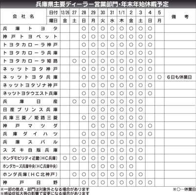 〈兵庫県主要ディーラー営業部門 2025~26年年末年始休暇予定〉