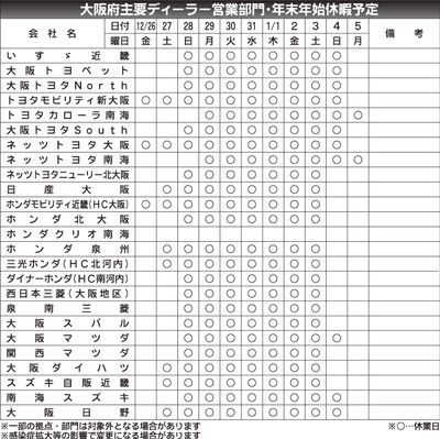 〈大阪府主要ディーラー営業部門 2025~26年年末年始休暇予定〉