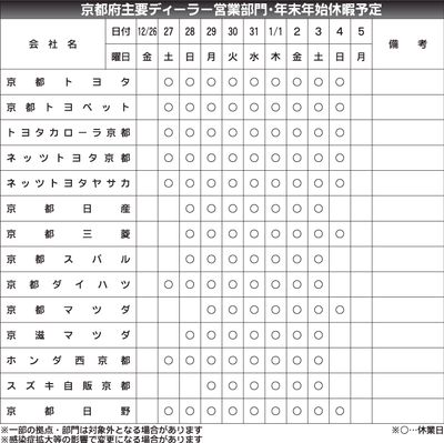 〈滋賀県主要ディーラー営業部門 2025~26年年末年始休暇予定〉