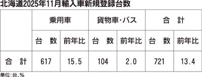 日本自動車輸入組合(JAIA)の発表によると、11月の道内輸入車新規登録台数(外国メーカー車と日本メーカー車)は前年同月比13.4%増の721台で、3カ月連続で前年を上回った。 乗用車は同15.5%増の617台で11カ月連続の前年超え、貨...