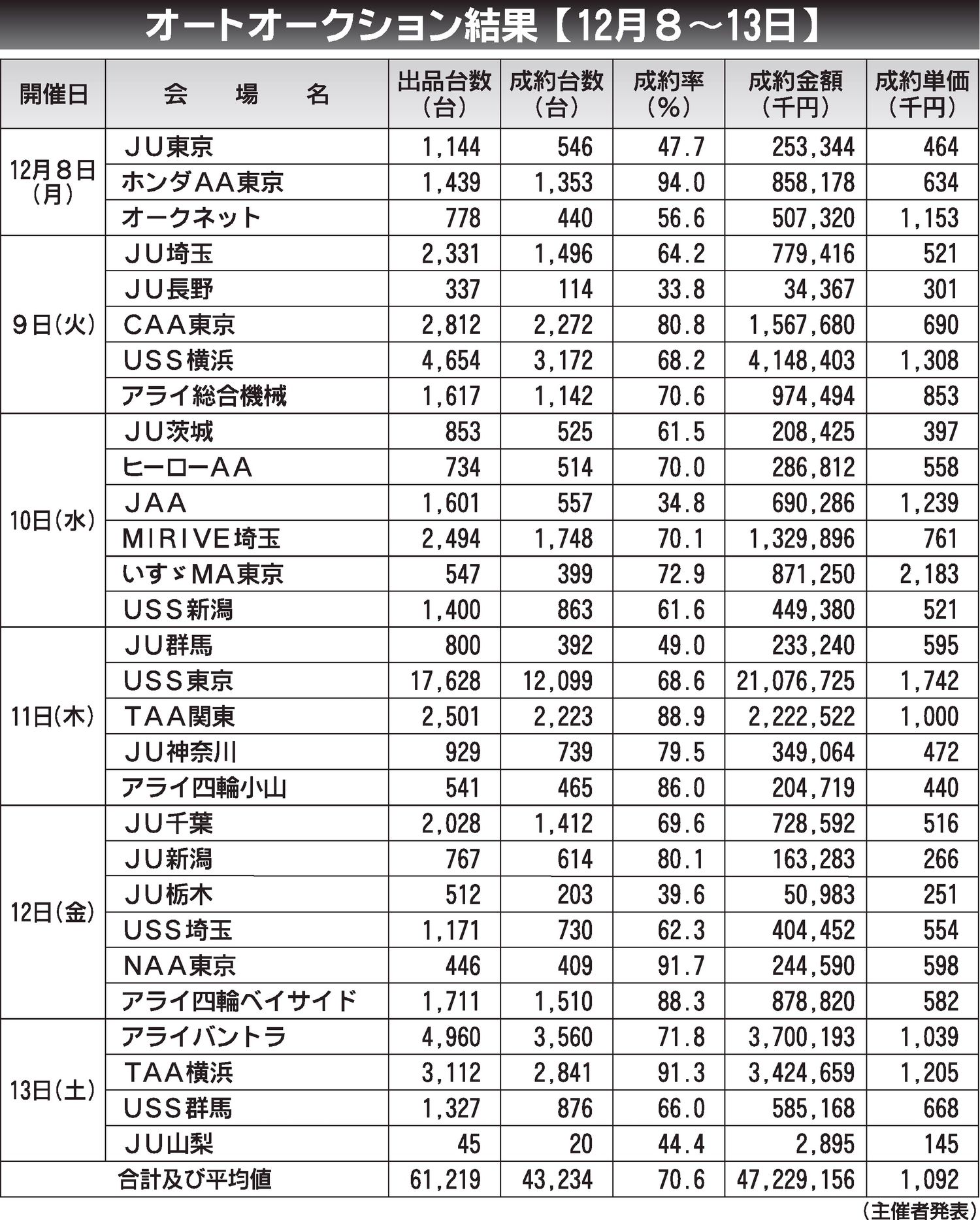 〈オートオークション結果〉首都圏 2025/12/8~13