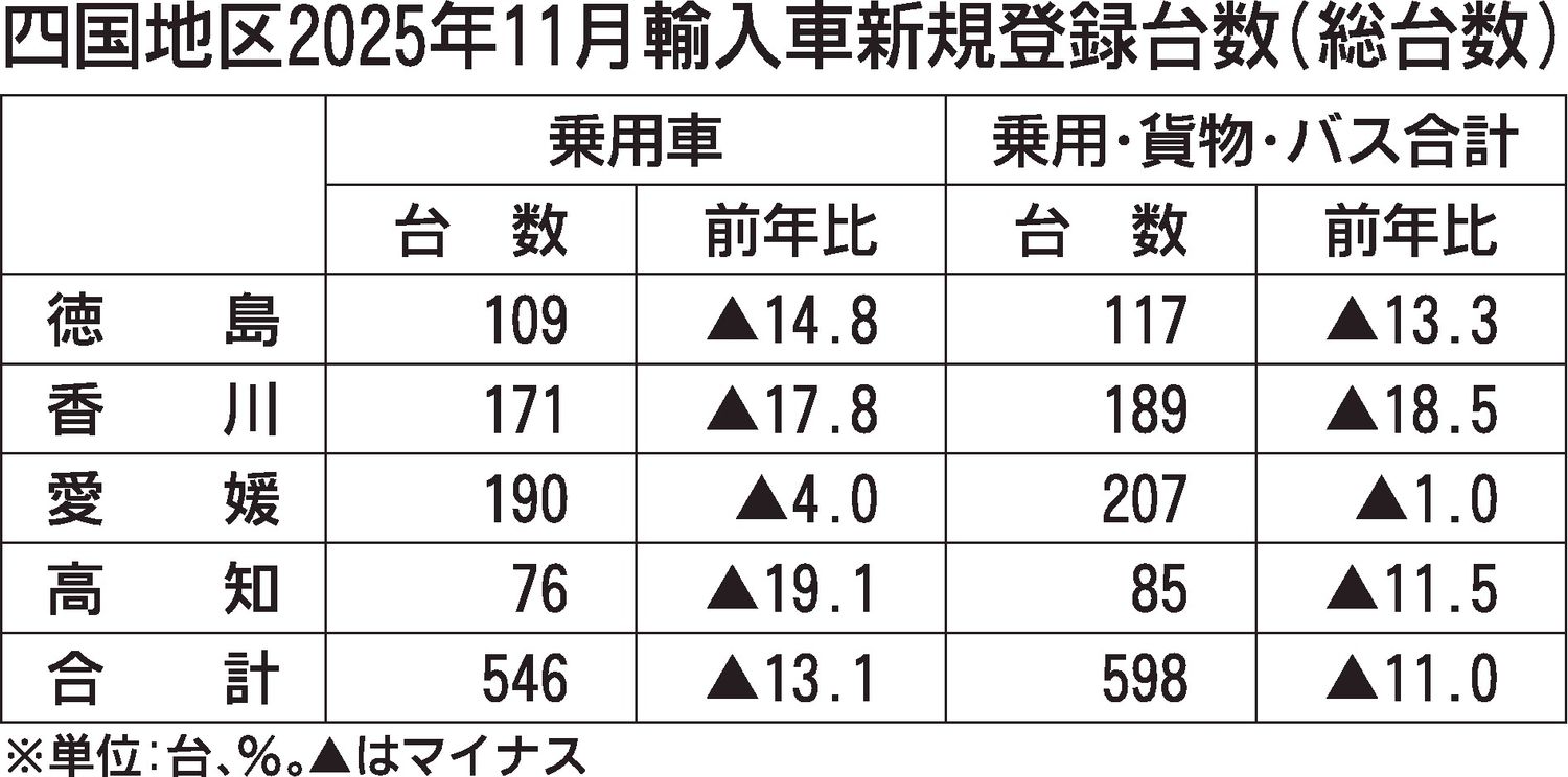 四国地区の2025年11月の新規輸入車登録台数(外国車メーカー、日本車メーカー)は前年同月比11.0%減の598台と3カ月ぶりに減少し、四国4県全てで前年実績を下回った。車種別では乗用車が同13.1%減の546台と大幅に落ち込んだ。 外国...