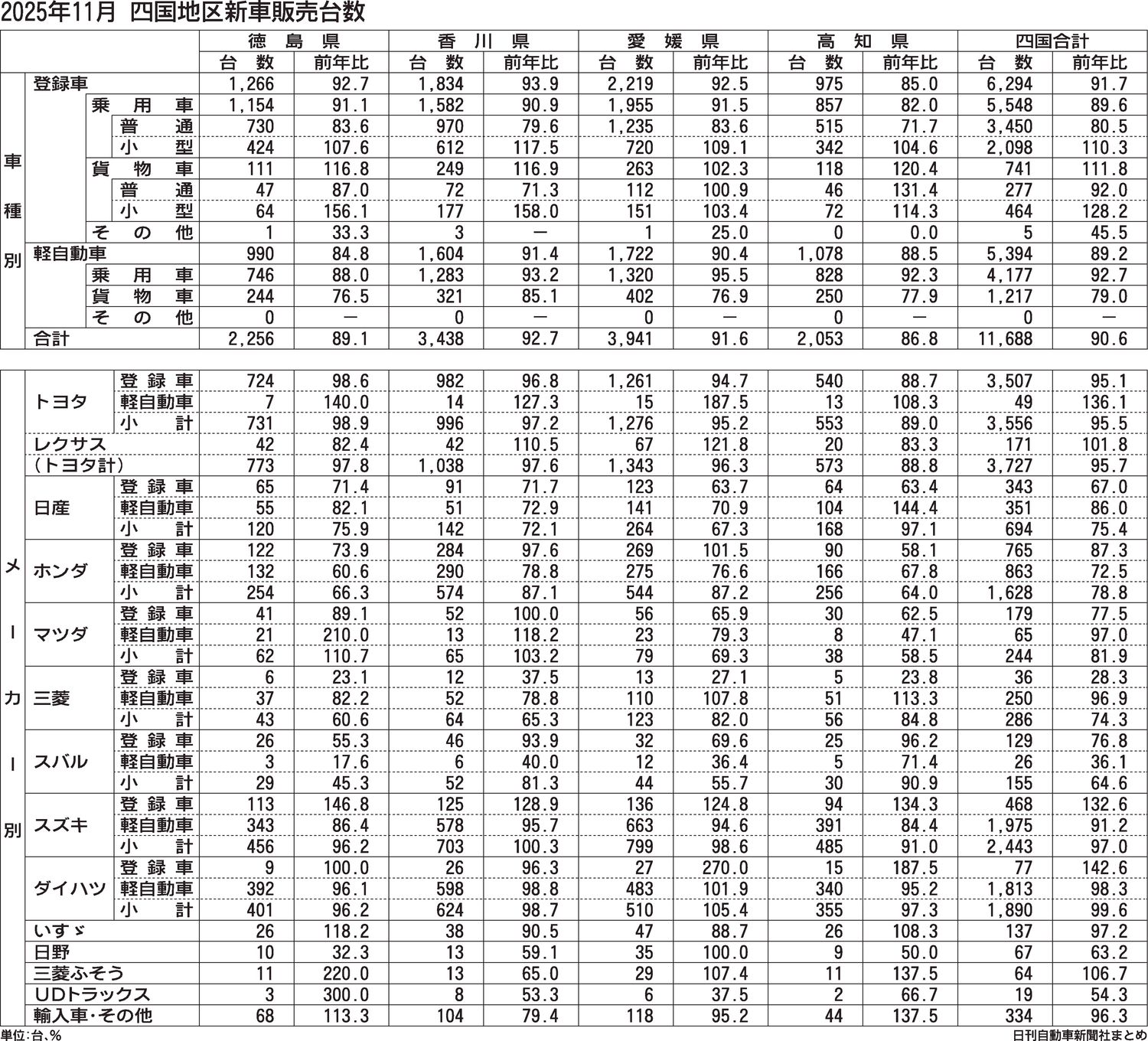 四国地区2025年11月の新車販売台数(登録車+軽自動車)は前年同月比9.4%減の1万1688台と5カ月連続の減少で、全国平均(5.1%減)に比べて減少幅が大きかった。車両価格の高騰などに起因する消費支出の抑制や人気車種の供給制限が影響し...