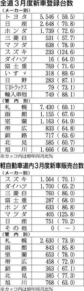 3月度の道内新車販売台数(含軽)は、前年同月比30・8%減の1万9647台に落ち込んだ。東日本大震災の影響で新車供給が滞り、登録車が32・6%減、軽自動車26・2%減となった。単月として、過去10年間で最大の減少幅だった。昨年秋から市場回...