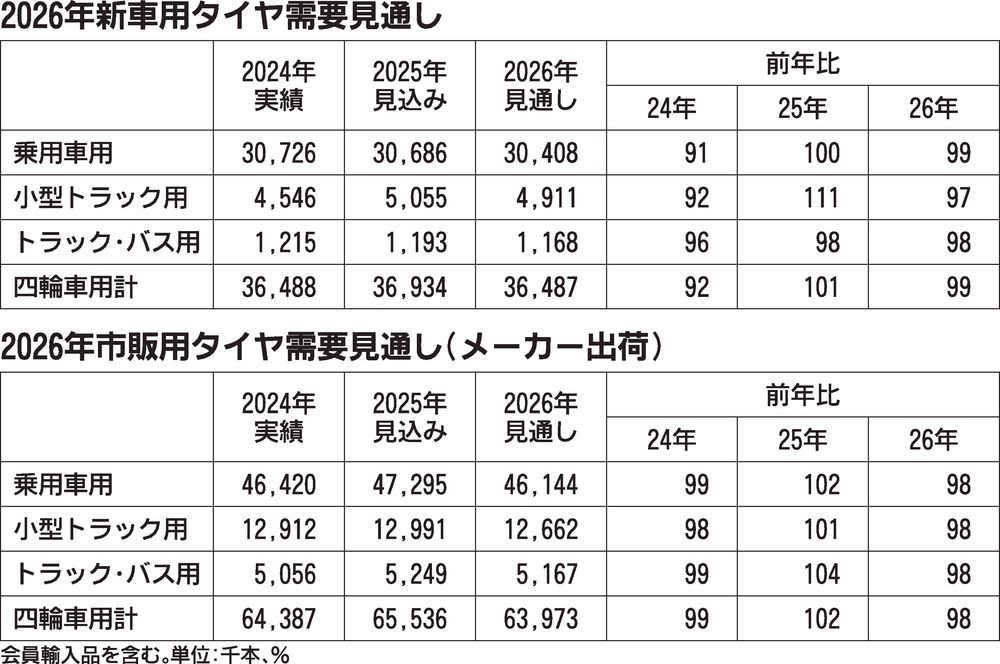 日本自動車タイヤ協会(JATMA、山本悟会長)は、2026年の国内四輪車用タイヤ需要(メーカー出荷ベース)について、25年見込み値から微減の1億46万本になるとの見通しを公表した。このうち、新車用タイヤはメーカー生産の減少を織り込み、同1...