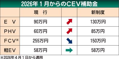 政府は「クリーンエネルギー自動車(CEV)導入促進補助金」を2026年1月から見直す方針を固めた。 電気自動車(EV)への補助金の上限額を現行の90万円から130万円に増やし、燃料電池車(FCV)を同255万円から150万円に減らすことで...