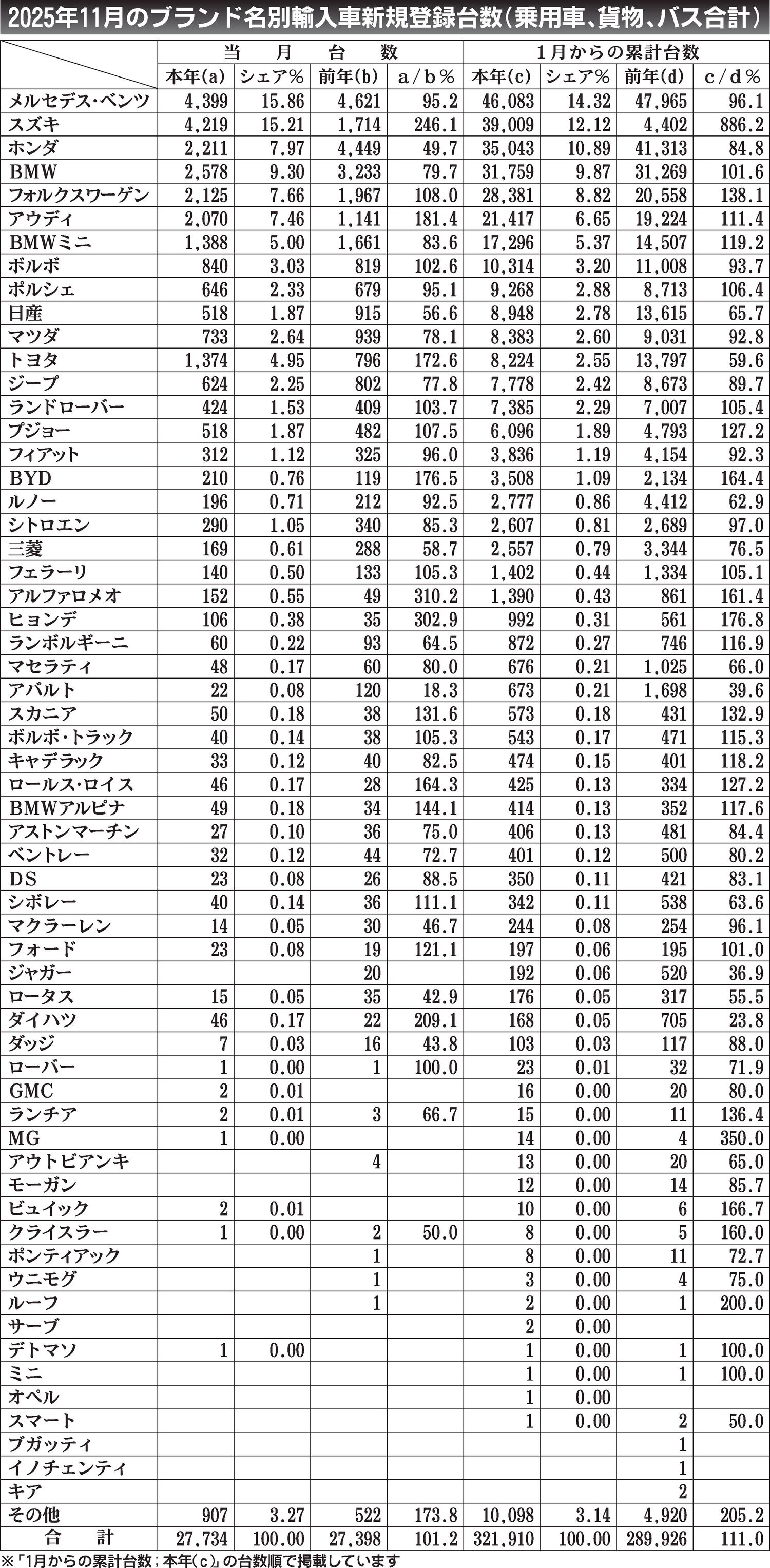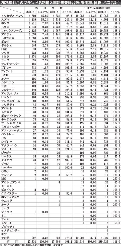 〈2025年11月の都道府県別別輸入車新規登録台数〉