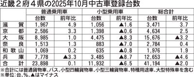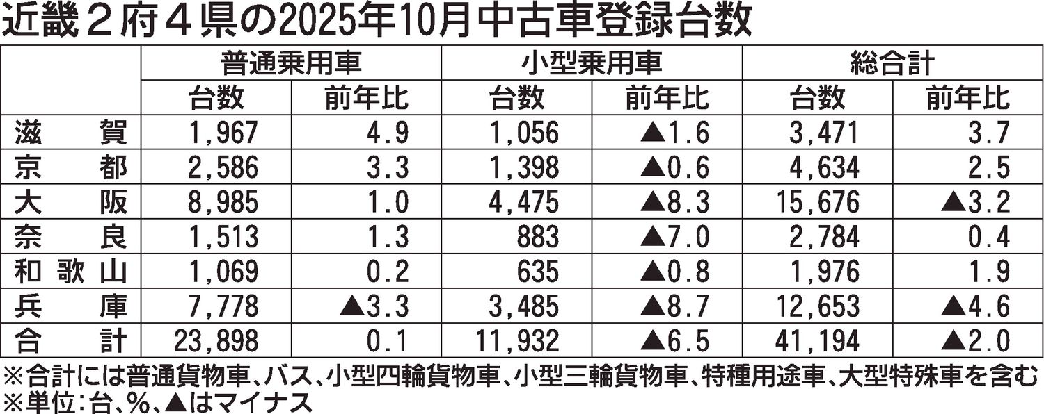 近畿2府4県2025年10月の中古車登録実績(軽自動車を除く)がまとまった。新規・移転・変更手続きを合算した登録台数は、前年同月比2.0%減の4万1194台だった。前年の伸びが大きかった反動もあり2カ月ぶりに減少した。 車種別では、普通乗...