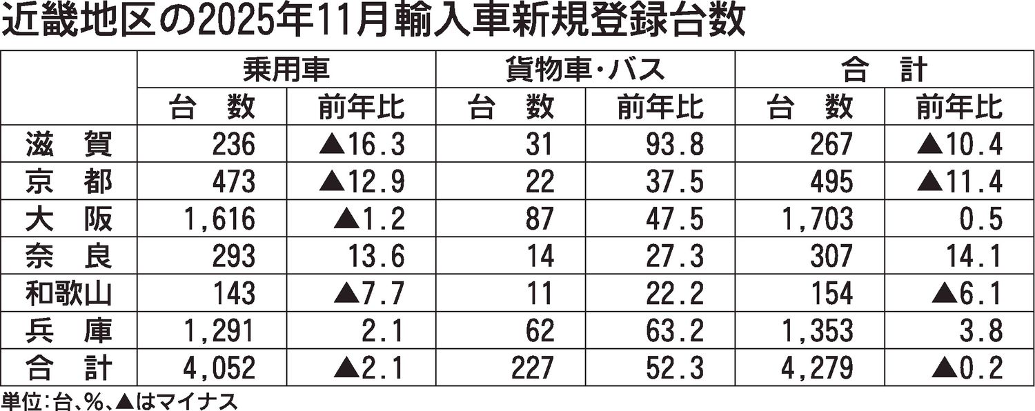 日本自動車輸入組合(JAIA)の発表によると、11月の近畿地区の輸入車新規登録台数(外国メーカー車と日本メーカー車)は、前年同月比0.2%減の4279台で、3カ月ぶりに減少した。 乗用車は同2.1%減の4052台で、3カ月ぶりのマイナス。...