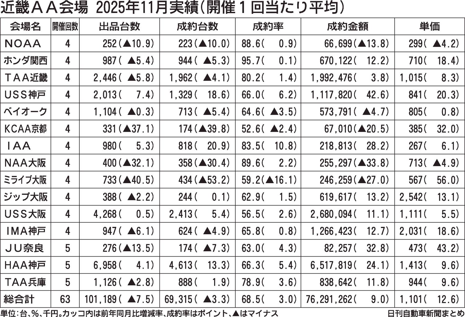 近畿地区にある中古車オークション(AA)15会場の11月実績がまとまった。開催回数は計63回で、前年同月比4回減。出品台数は同7.5%減の10万1189台で、11カ月ぶりにマイナスを記録した。一方で、成約率や成約金額、単価は前年同月実績を...