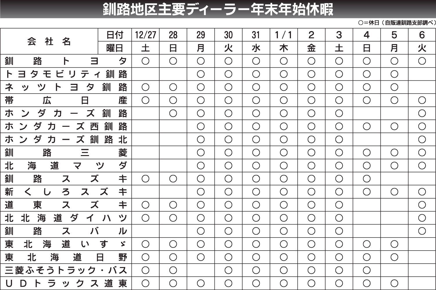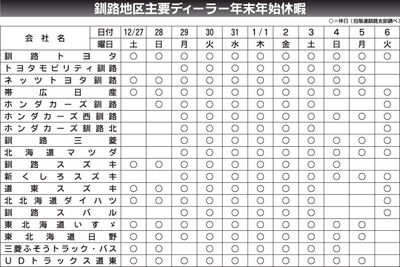 〈北見地区主要ディーラー年末年始休暇〉2025/12/7~2026/1/7