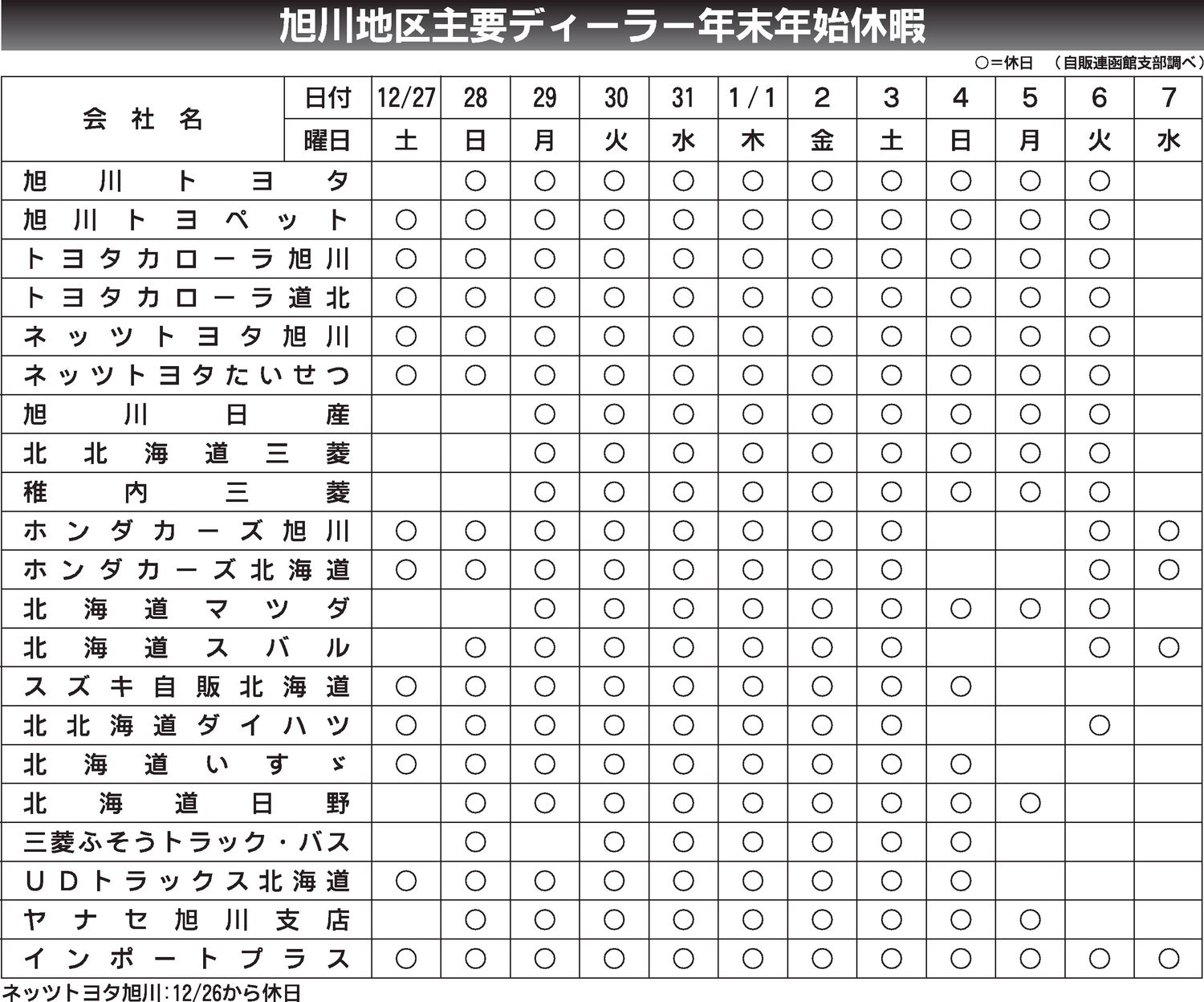 〈旭川地区主要ディーラー年末年始休暇〉2025/12/7~2026/1/7