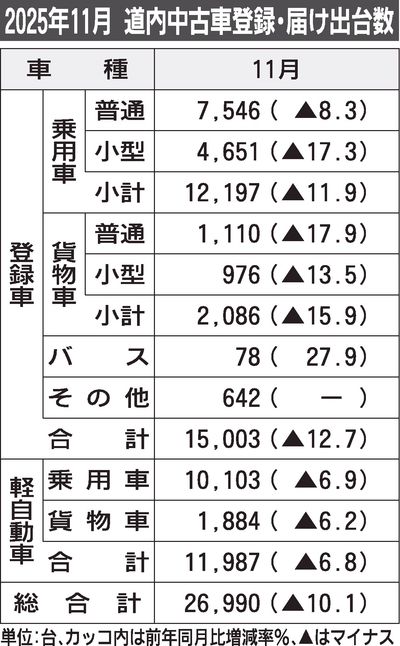 2025年11月道内中古車 2カ月連続で減
