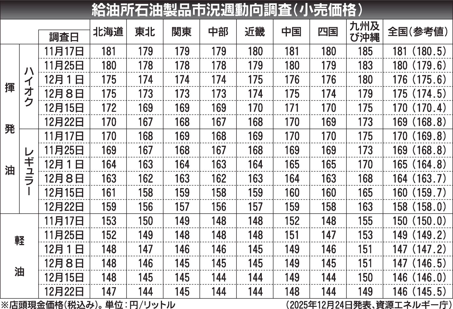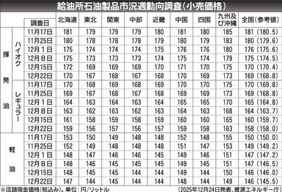 〈給油所石油製品市況週動向調査(小売価格)〉2025/11/10~12/15