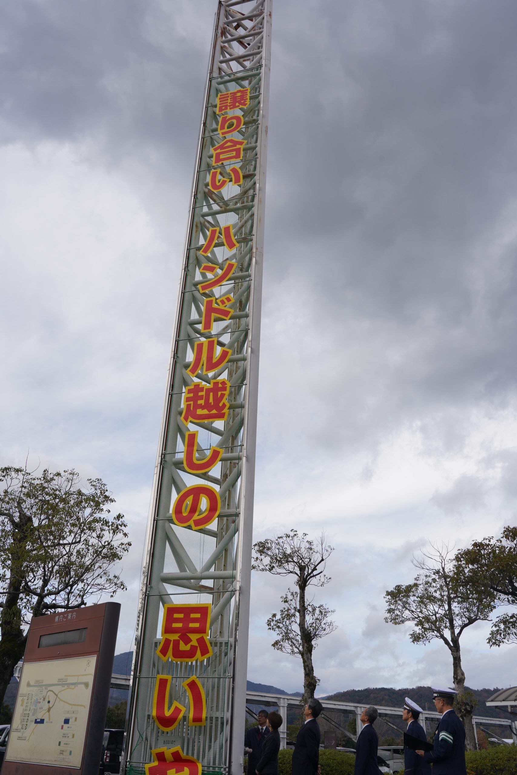 広島県の自動車関係4団体で組織する広島県自動車販売・整備団体交通安全対策推進協議会(藤井一裕会長)と広島県警察は、交通安全の意識を高めようと2026年の広島県交通安全年間スローガン懸垂幕を広島県運転免許センター(広島市佐伯区)に掲出した=写...